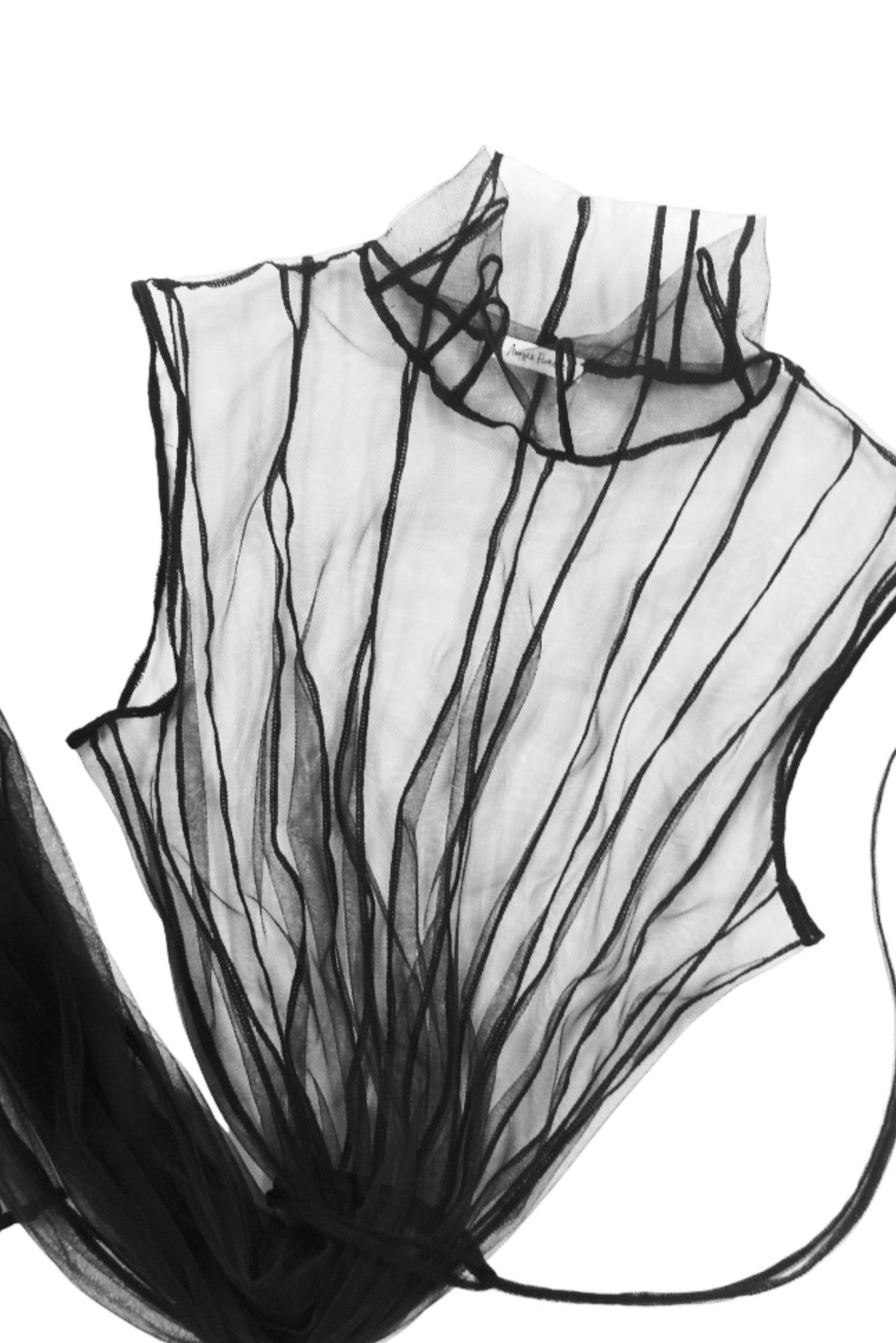 This soft, sheer tulle dress has a stand-up collar and vertical panels with overlock stitch detailing. It is perfect for the summer as a bathing suit cover or over a slip dress.