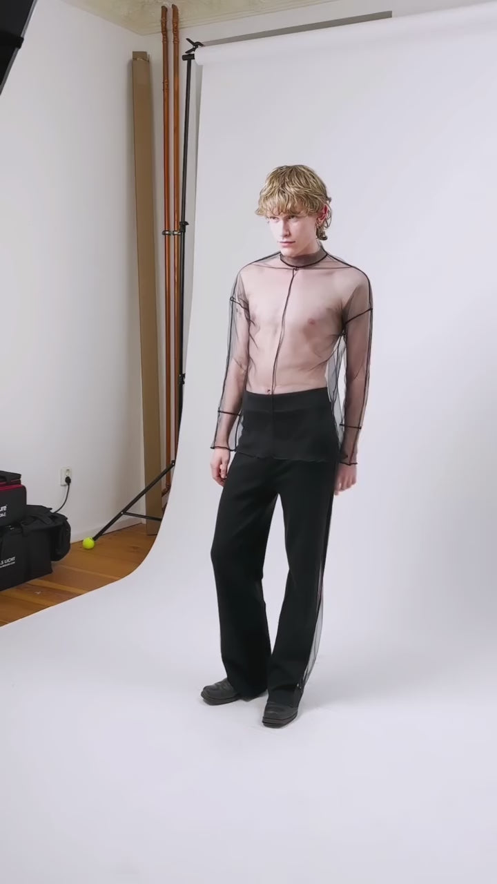 This tulle top has a turtle neck, trimmed with overlock stitches. The long sleeves end in subtly flared cuffs. Wear it solo or as an under-layer. This top will give you a captivating halo effect.