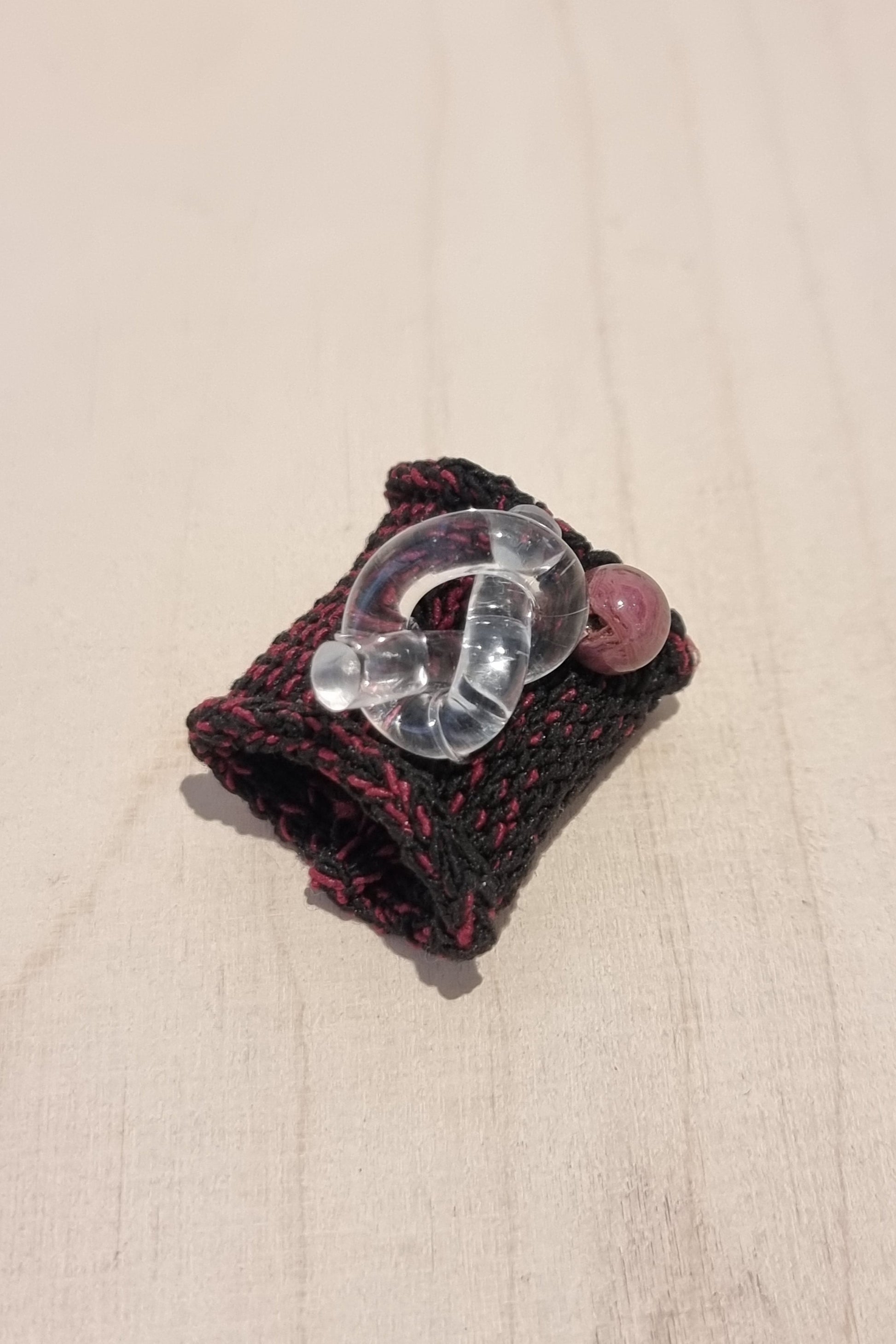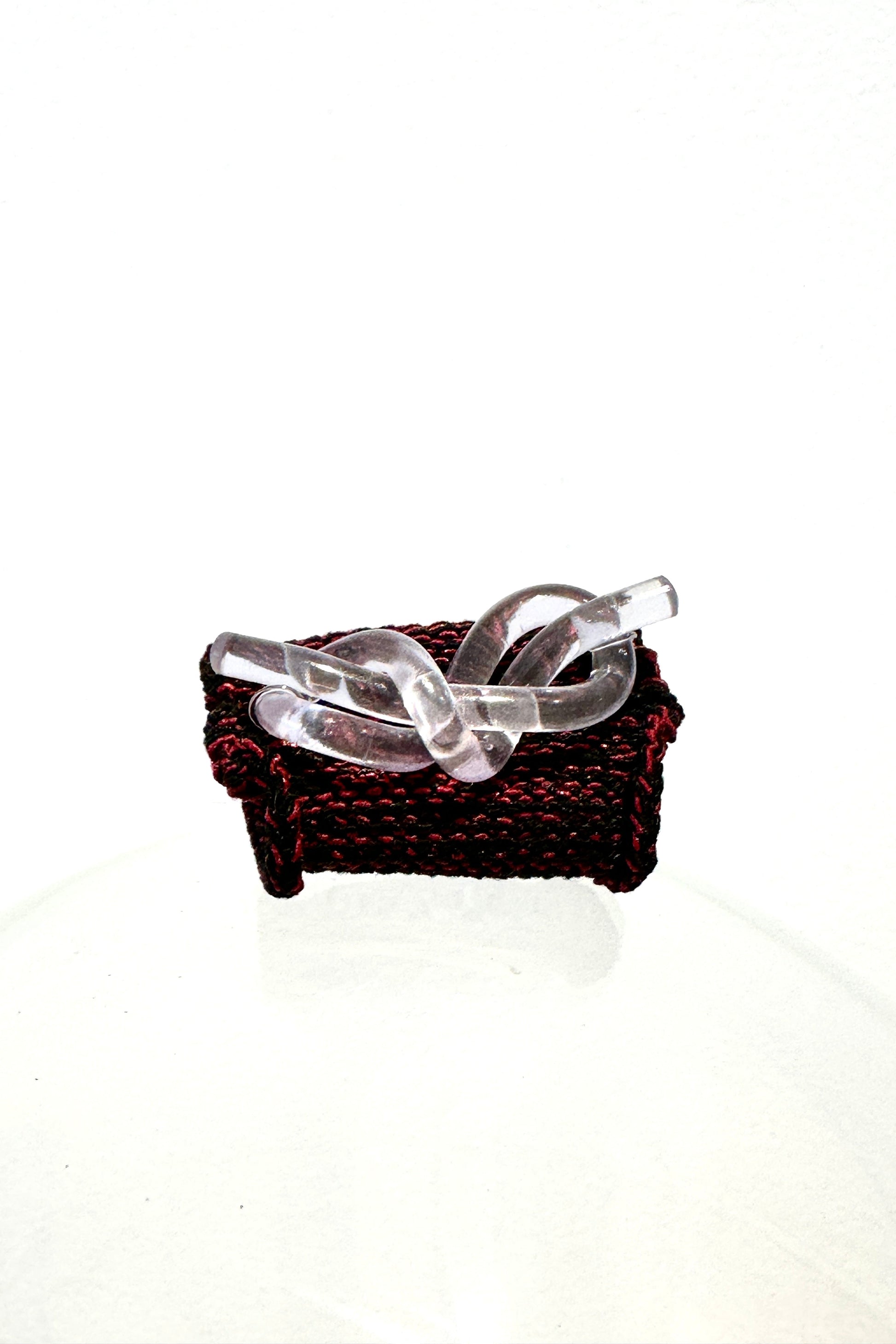 Silvia’s knots and hand-manipulated acrylic elements intertwine with Ekaterina’s knitted ropes and semi-precious stones. Each piece is handcrafted using leftover production materials, deadstock yarns, and pre-existing objects collected and archived by the designers themselves.