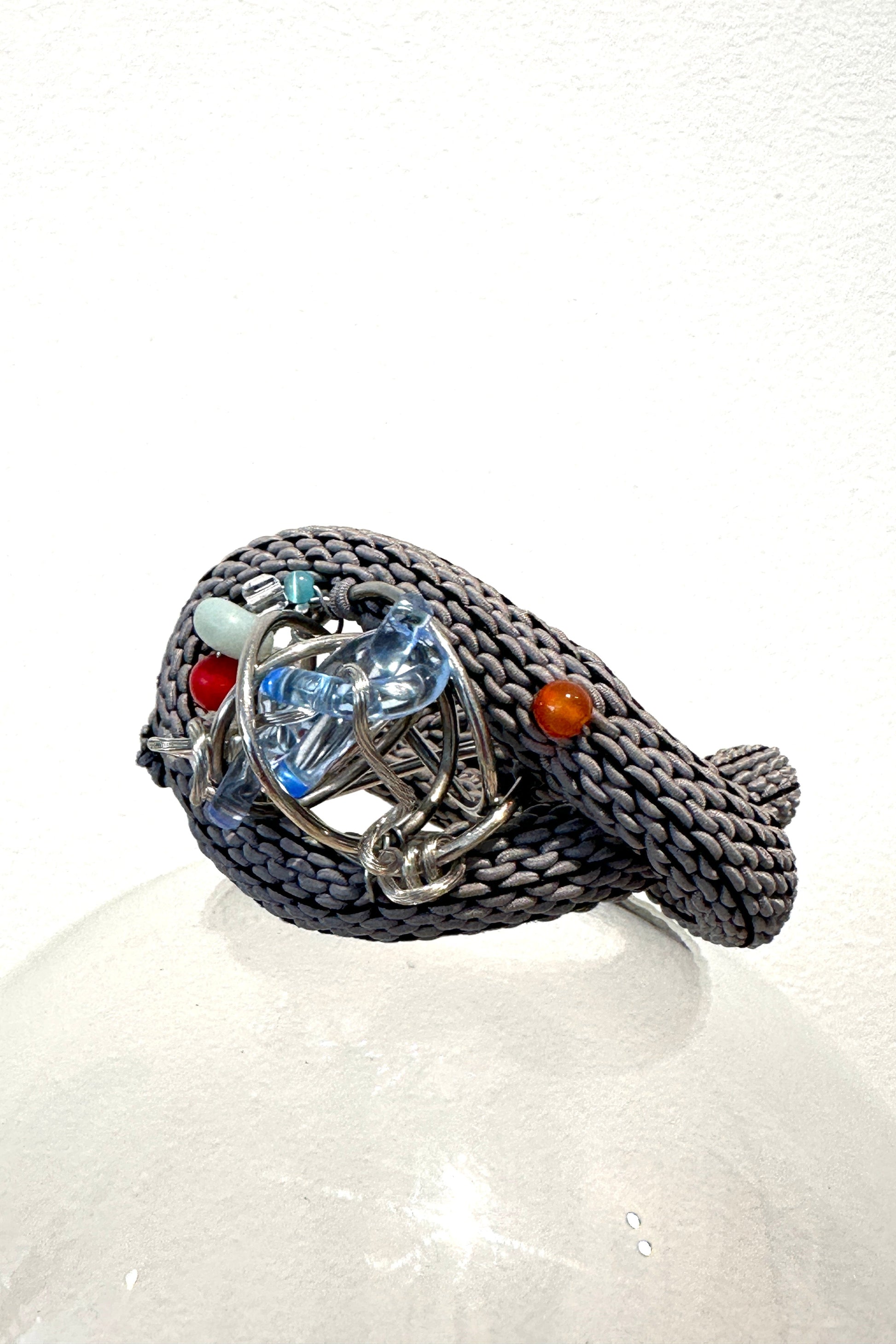 Silvia’s knots and hand-manipulated acrylic elements intertwine with Ekaterina’s knitted ropes and semi-precious stones. Each piece is handcrafted using leftover production materials, deadstock yarns, and pre-existing objects collected and archived by the designers themselves.