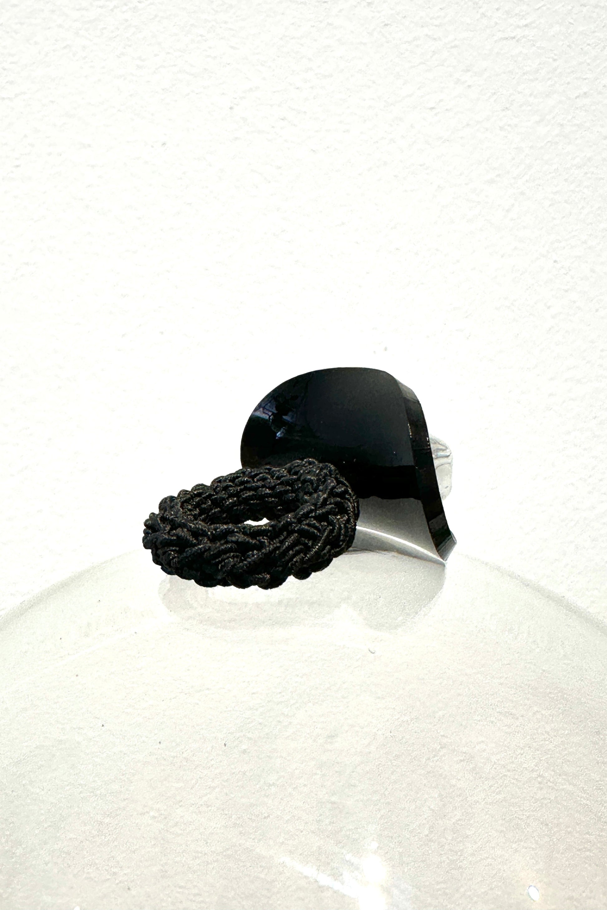 Silvia’s knots and hand-manipulated acrylic elements intertwine with Ekaterina’s knitted ropes and semi-precious stones. Each piece is handcrafted using leftover production materials, deadstock yarns, and pre-existing objects collected and archived by the designers themselves.