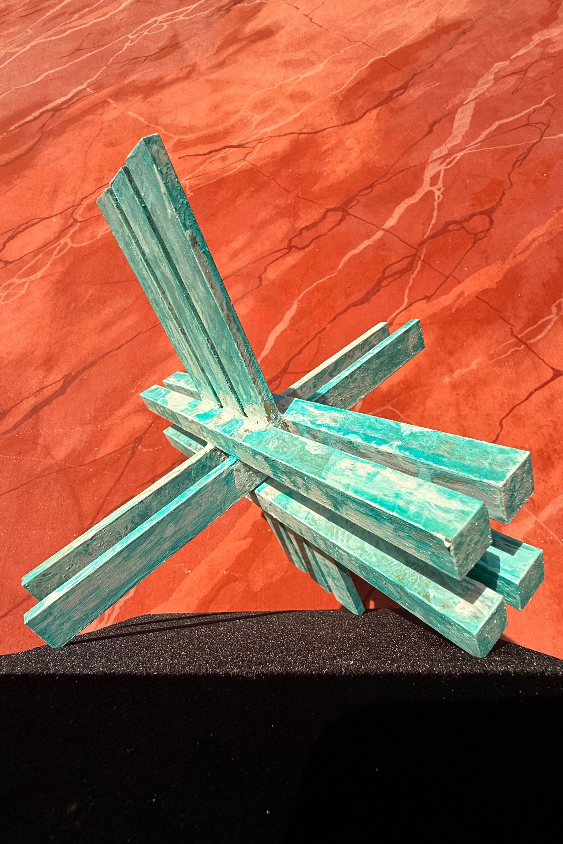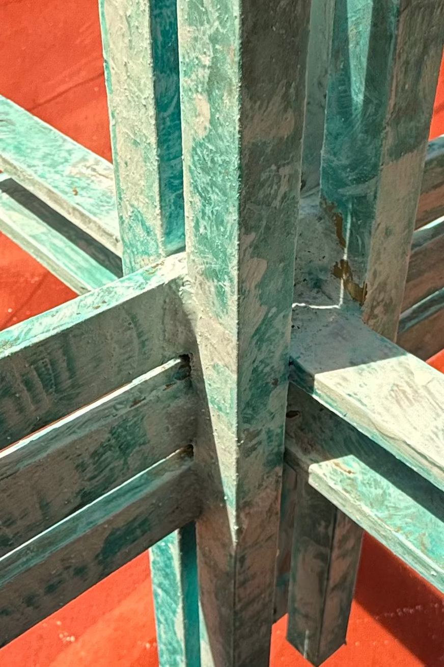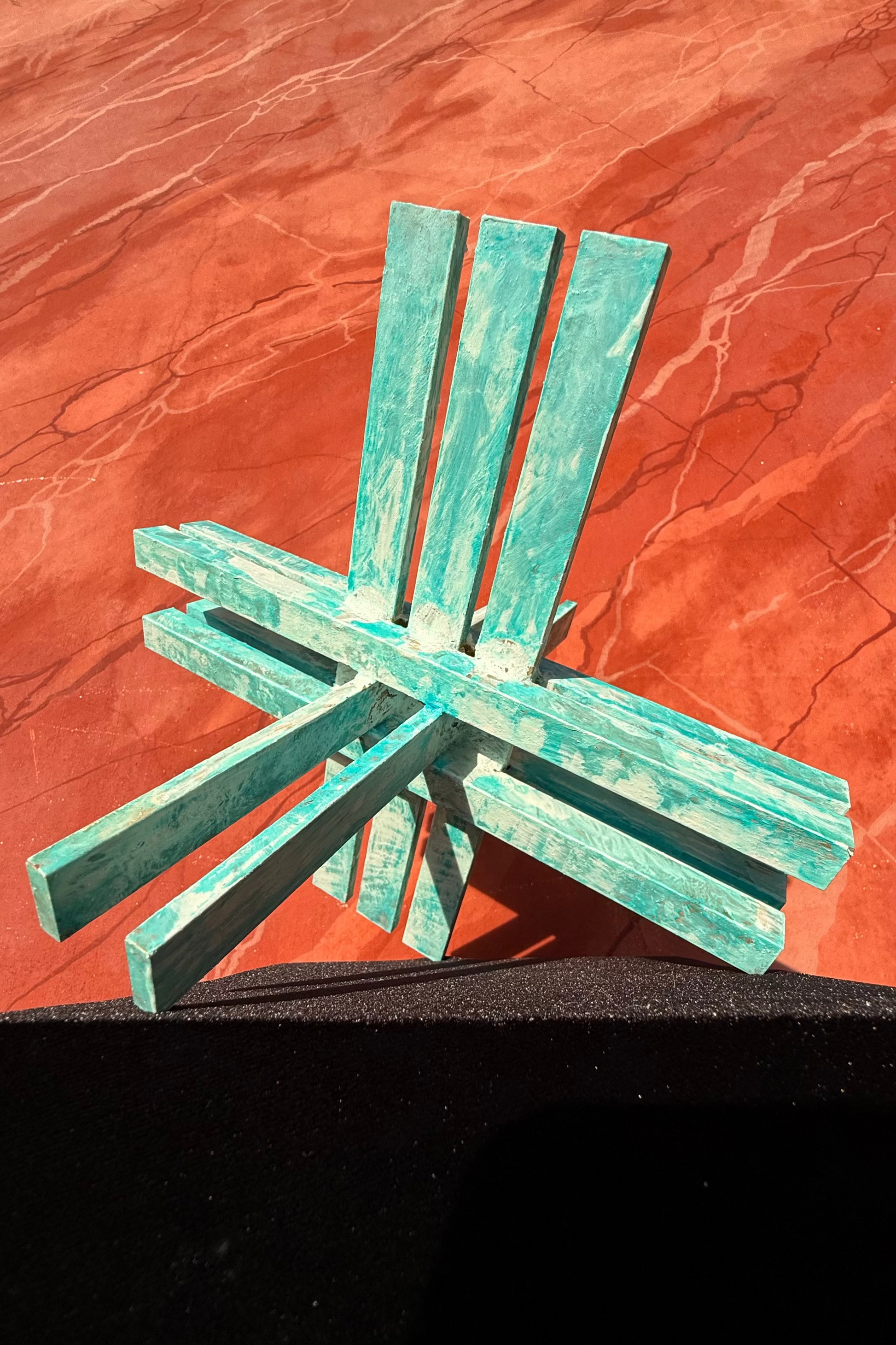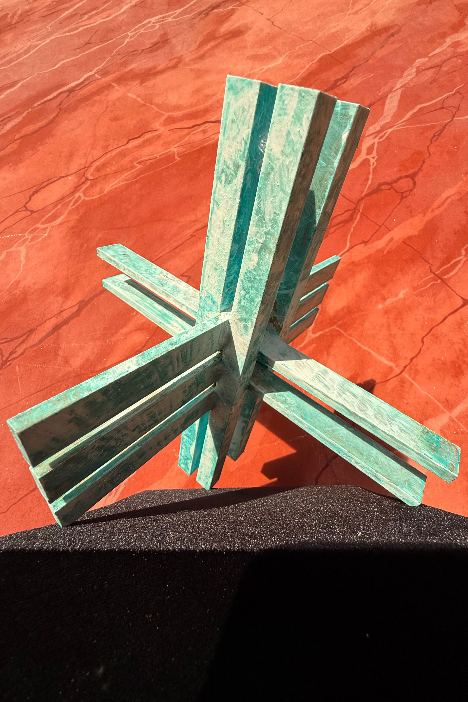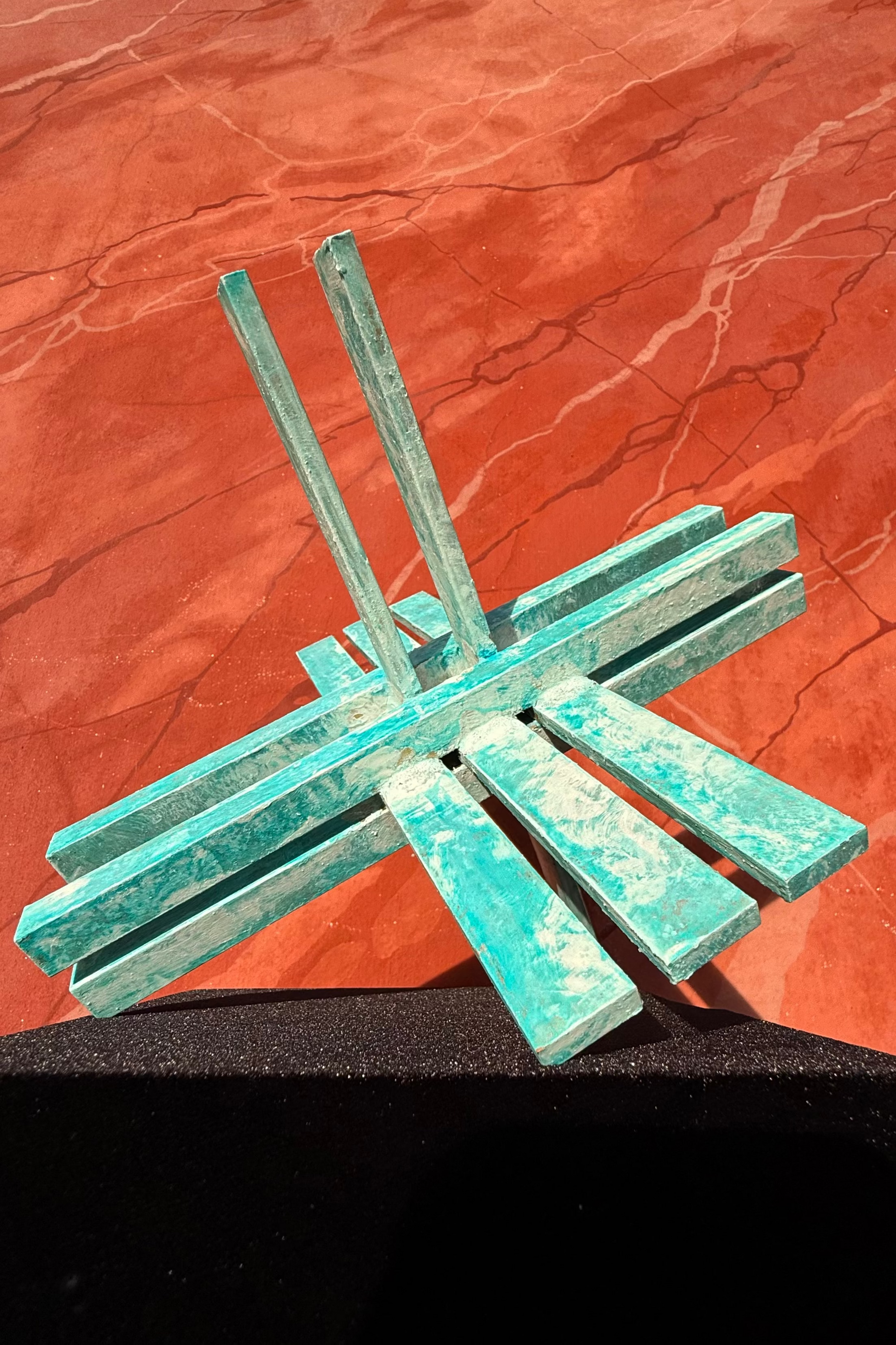 Die türkis-blaue Patina verleiht dem schweren Material eine lebendige, fast architektonische Oberfläche. Oxidationsspuren und feine Unregelmässigkeiten bleiben sichtbar und unterstreichen den handwerklichen Charakter. Die abschliessende Wachsschicht schützt die Patina und verstärkt ihre Tiefe, ohne den rohen Ausdruck des Materials zu glätten.