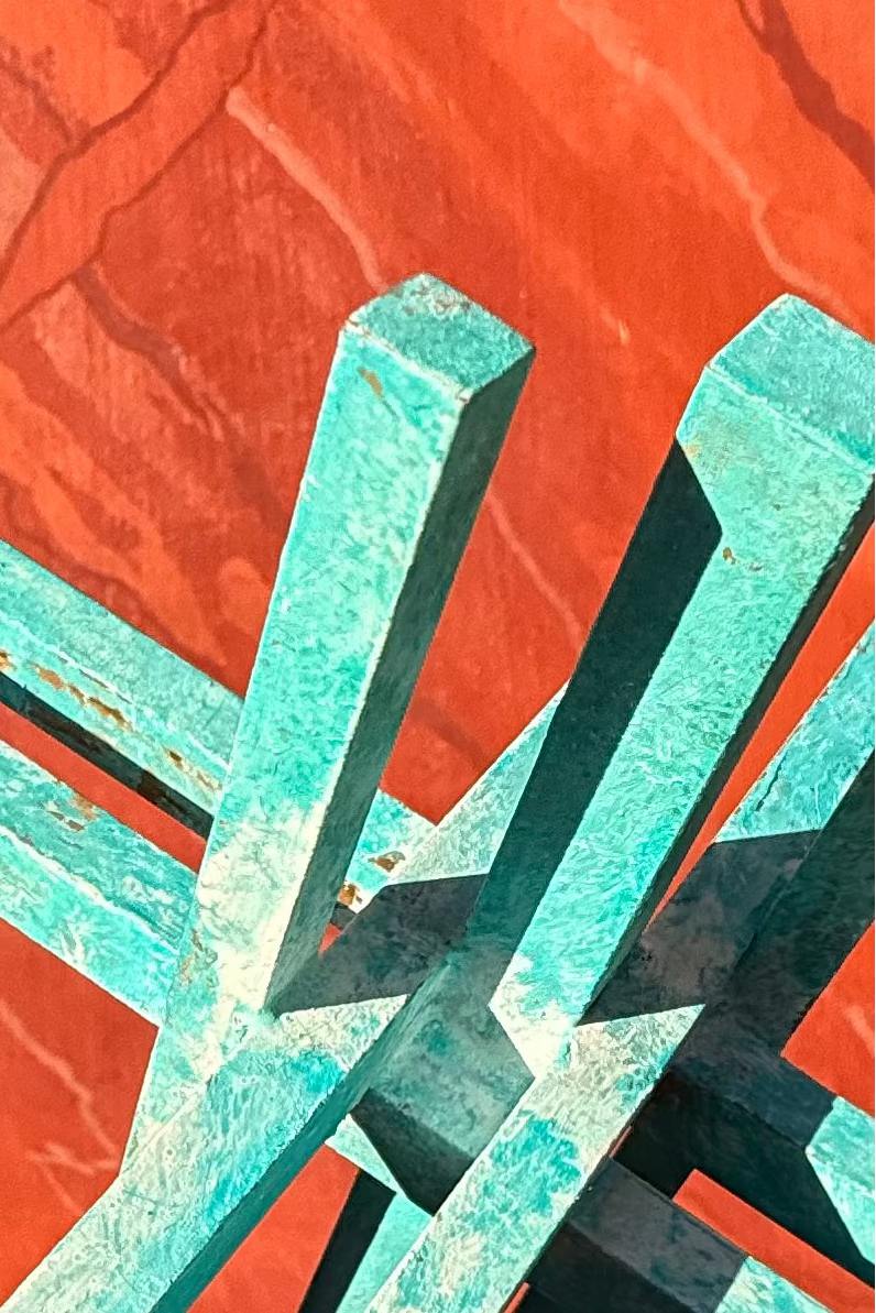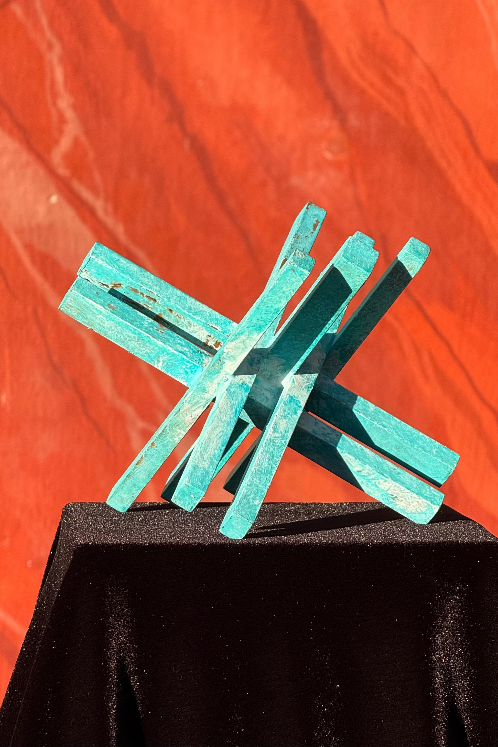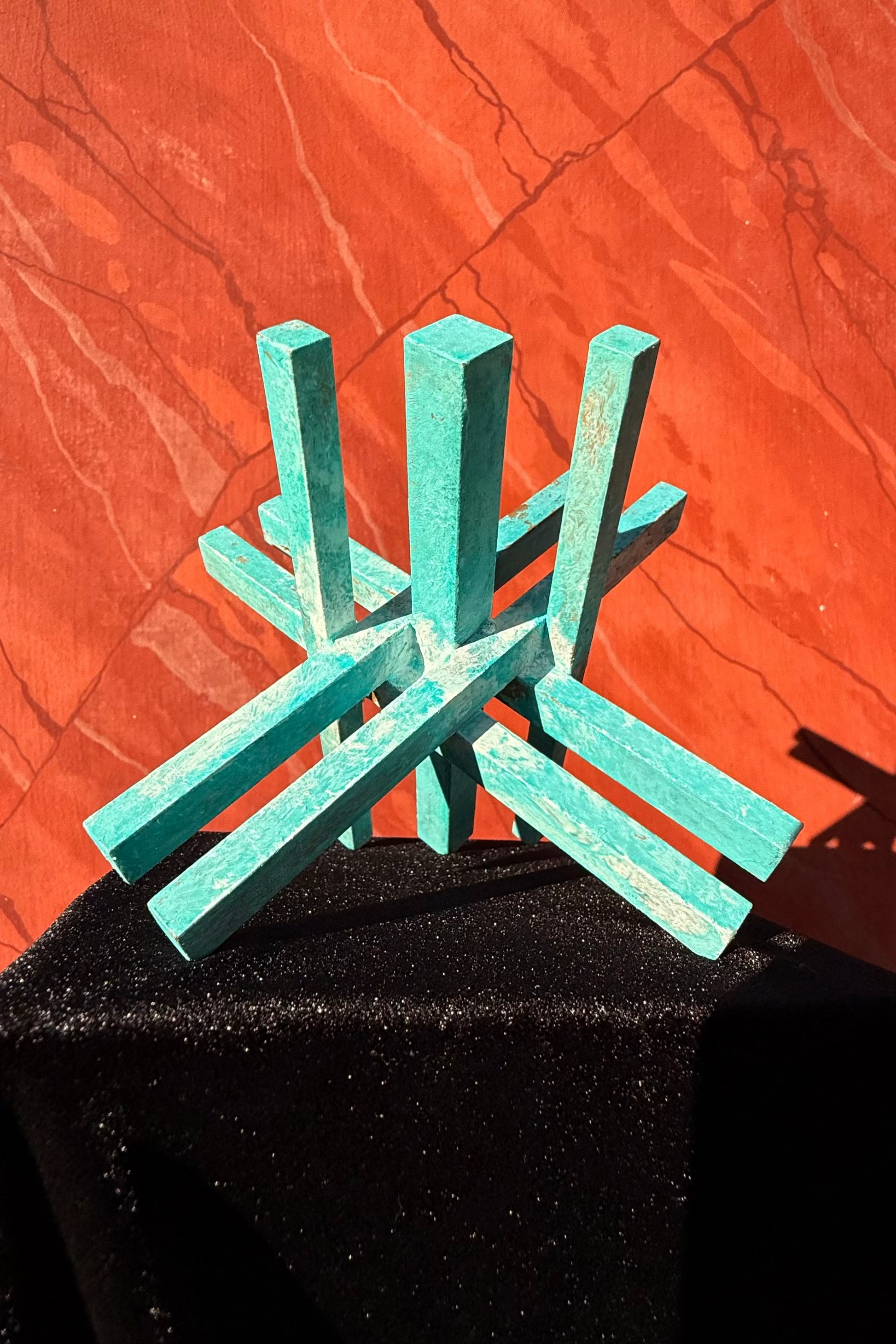 Die türkis-blaue Patina verleiht dem schweren Material eine lebendige, fast architektonische Oberfläche. Oxidationsspuren und feine Unregelmässigkeiten bleiben sichtbar und unterstreichen den handwerklichen Charakter. Die abschliessende Wachsschicht schützt die Patina und verstärkt ihre Tiefe, ohne den rohen Ausdruck des Materials zu glätten.