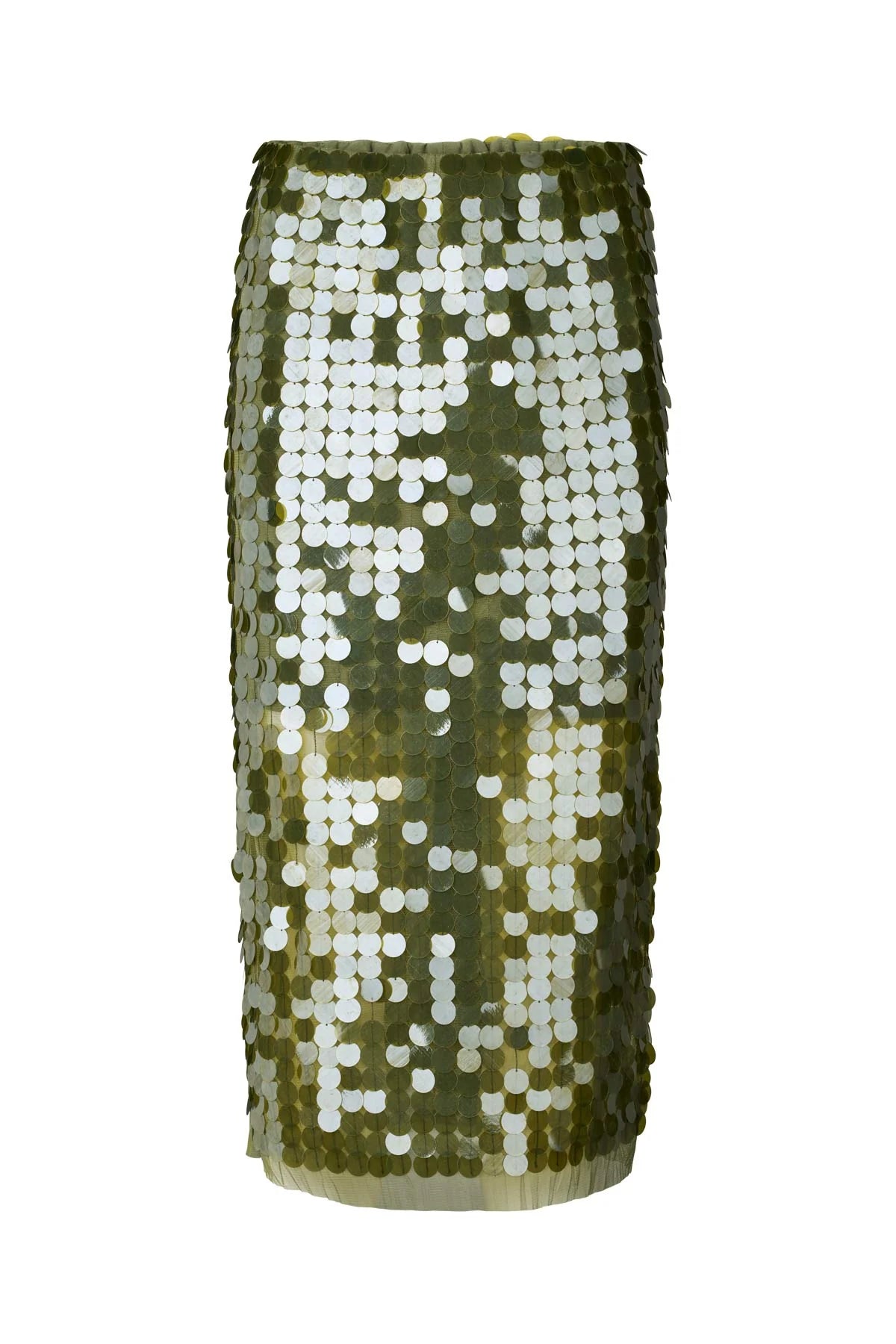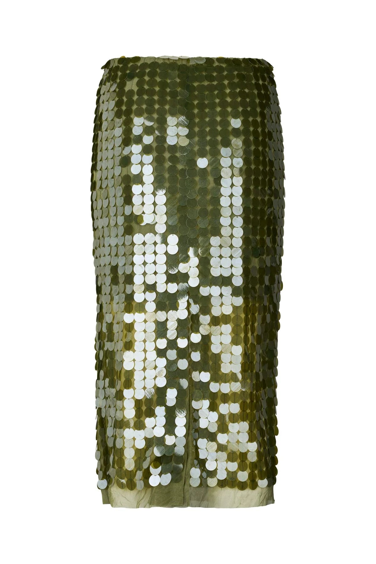 Create a glamorous look with this skirt decorated with eye-catching large round sequins for a shiny, antique and sophisticated look. Underneath the sequins is a fine layer of light tulle that adds a romantic and feminine touch. This skirt is perfect for festive occasions where you want to stand out with a unique and elegant design that balances between the bold and the delicate.