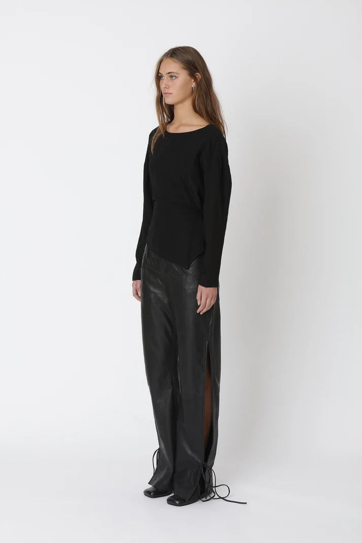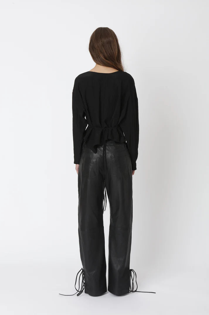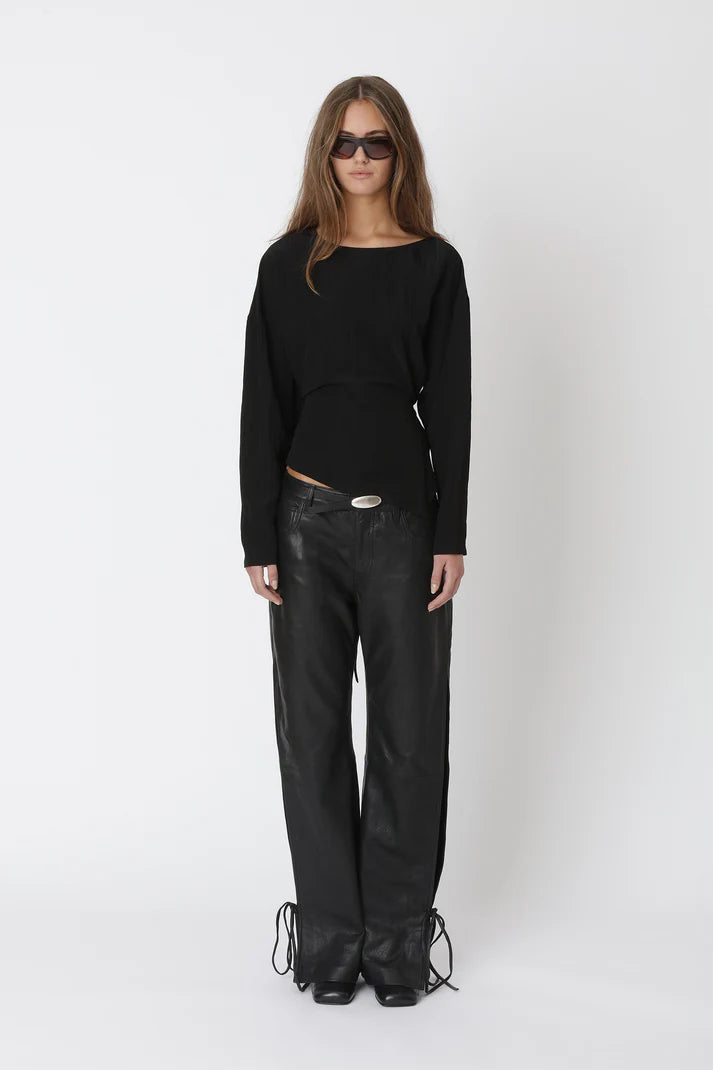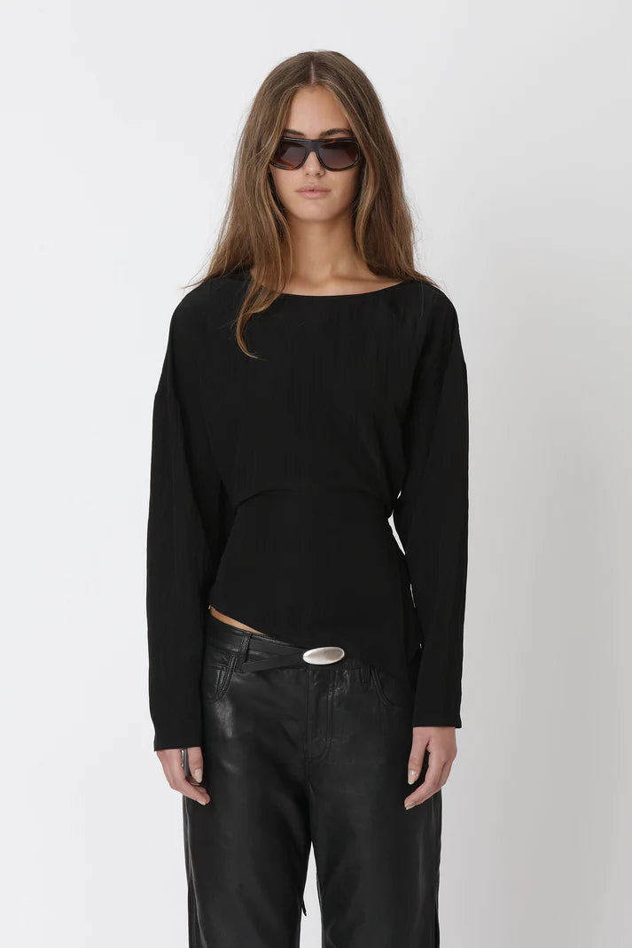 The Hailee Shirt is crafted from a light, drapey textured fabric, featuring an open, asymmetrical neckline. It has a straight fit when untied, and the hem is asymmetrical, making it the perfect match for your Won Hundred jeans.
